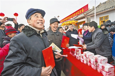 1月18日,榆阳区赵家峁村股份经济合作社举行分红大会。这是村民们领到分红款后,脸上露出了幸福的笑容。